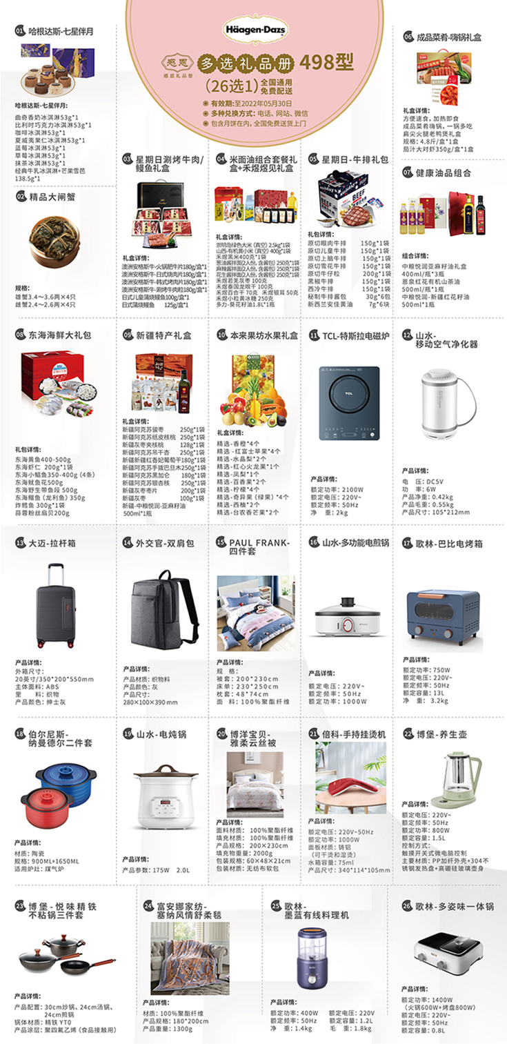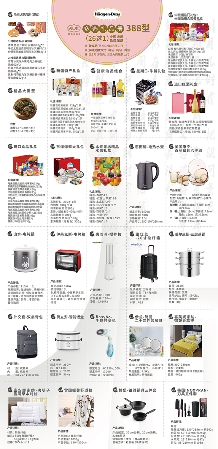 使用方法: 1.以下26种礼品可任意选择一款,全国免费送货上门; 2. 送货预约兑换方式: ①.手机微信扫二维码预约;②.网站预约;③.电话预约 有效期: 1.本礼品券有效期: 2021年8月1日至2022年5月30日止 2.月饼类提领有效期:2021年9月14日止